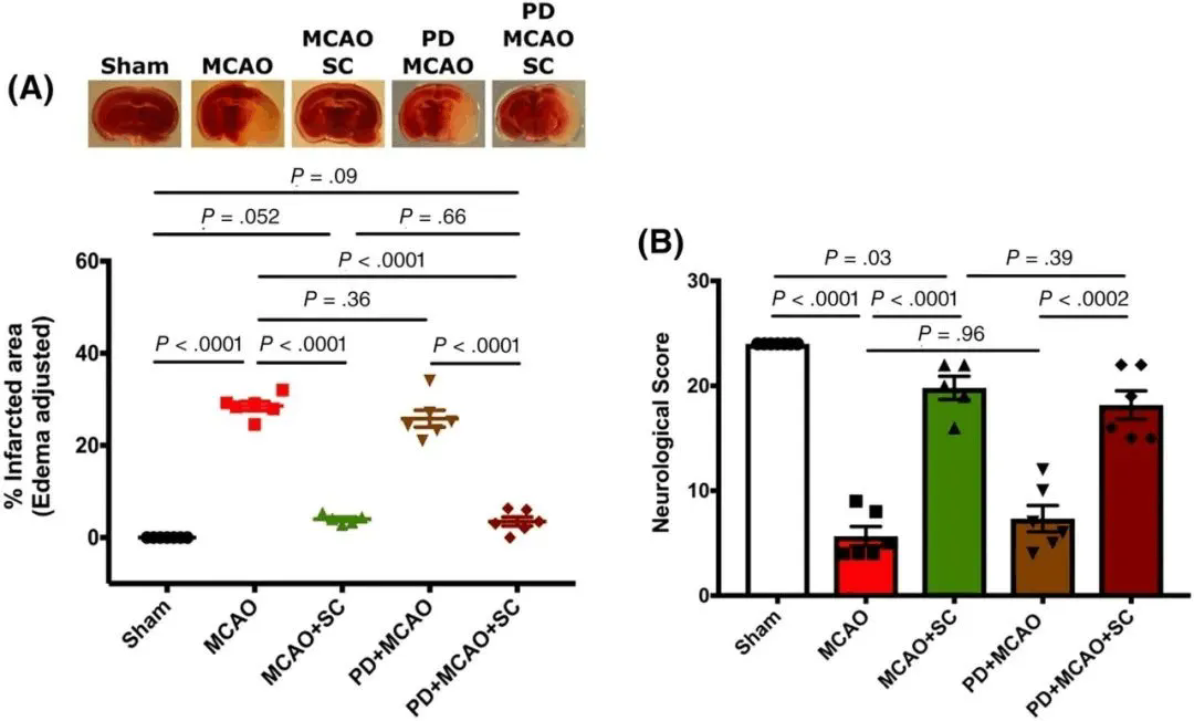 的类型。据悉,新冠感染康复患者继续发展为急性缺血性中风的风险依然很高,成为了新冠常见临床特征和后遗症之一。临床上,对于中风的治疗包括组织纤溶酶原激活剂和抗血栓形成剂,但这受到出血时间的极大限制,风险依然很高,中风的关键急性期仍缺乏有效和安全的疗法,这也促使研究人员探索新的替代疗法以减少脑损伤。基于干细胞的组织分化、再生修复潜力,已经在治疗缺血性中风中起到疗效,但除了转化为神经细胞外,近日有研究人员发现,人胎盘间充质干细胞(hPMSCs)还可通过分泌神经保护因子的旁分泌信号通路提供急性保护。研究显示,干细胞可通过旁分泌显著保护大脑免受中风后损伤,这为缺血性中风提供了创新方法,在不久的将来或为中风提供新的治疗策略。在临床上,中风主要分为两大类型,一类是出血性中风,一类是缺血性中风。出血性中风包括临床上诊断的脑出血和蛛网膜下腔出血两种比较不常见;缺血性中风临床常用的诊断分类名词较多,包括脑梗塞(或称脑梗死)、脑血栓形成、脑栓塞等,也是临床上最常见的类型之一。缺血性中风占中风总发病率的87%,是老年人神经系统疾病的主要原因,最近有报告显示,多达5%的新冠病毒感染患者可能会继续发展为急性缺血性中风,这也是新冠的常见临床特征及后遗症。临床上的治疗方法多半会受到脑出血时间限制,一般脑中风的黄金抢救时间是3.5小时,中风的抢救就是在跟时间赛跑,争分夺秒,越早越好,一旦错过黄金抢救时间,致残率、致死率将成倍提高。而中风后发生的脑损脑中风患者挥之不去的后遗症,如何有效避免损伤部位继续扩大成为了研究人员需要探索的新领地,这关乎患者预后的生活质量。近年来,随着再生医学的发展,基于干细胞的疗法代表了一种治疗心血管疾病(包括缺血性中风)的创新疗法。长期以来,人们一直认为干细胞可通过中风后脑组织内移植和分化来修复受损细胞提供治疗益处,而最近的一项研究又有了新的发现,这项来自美国Ochsner-LSU健康科学中心的研究团队发现:干细胞强大的旁分泌功能,对减轻脑卒中后损伤和改善神经功能障碍具有良好的保护作用。研究报告指出,干细胞通过旁分泌信号传导来限制初始组织损伤,从而防止中风中急性脑损伤。主要体现在以下三个方面。维持中风后脑血流量,研究发现胎盘间充质干细胞能够表达大量的血管紧张素转换酶-2 (ACE-2),它的产物(Ang1-7)与相关受体结合后,发挥血管舒张、抗氧化、抗炎等作用。之前ACE2/Ang1-7信号被认为是中风治疗的重要靶点,如今发现胎盘间充质干细胞输注后所释放的胞外囊泡到达脑部,其中的ACE2及其产物可以维持急性脑卒中模型小鼠的脑血流量,缩小了脑梗死体积,对防止中风慢性脑结构和功能损伤的延续具有重要意义。促进微血管及神经网络修复,研究发现间充质干细胞可表达肝生长因子、白介素8、血管生成素等血管生成因子,促进脑卒中后血管生成与重塑,减轻血脑屏障破坏;此外,间充质干细胞还分泌多种神经营养因子,促进神经树突棘产生和轴突生长,并且刺激内源神经祖细胞增殖,增强神经再生。调节脑卒中后炎症反应,脑卒中后过度炎症反应可降低神经元活力,扩大梗死区,阻碍组织修复与再生。该项研究显示,间充质干细胞治疗抑制了缺血半脑和外周血促炎细胞因子产生,升高抗炎因子IL-10水平,且增加免疫调节性细胞亚群数量,抑制炎症反应。hPMSCs衍生的ACE-2产品可独立于AT2受体防止缺血性损伤综上所述,间充质干细胞的旁分泌功能可维持中风后脑血流量,促进微血管及神经网络修复,还能调节炎症反应,对于脑中风后的脑损伤具有重要的治疗意义,这也为脑中风提供了新的治疗策略,相信随着再生医学的不断发展,干细胞也将展现更多的治疗益处,为多种疾病解除烦恼。